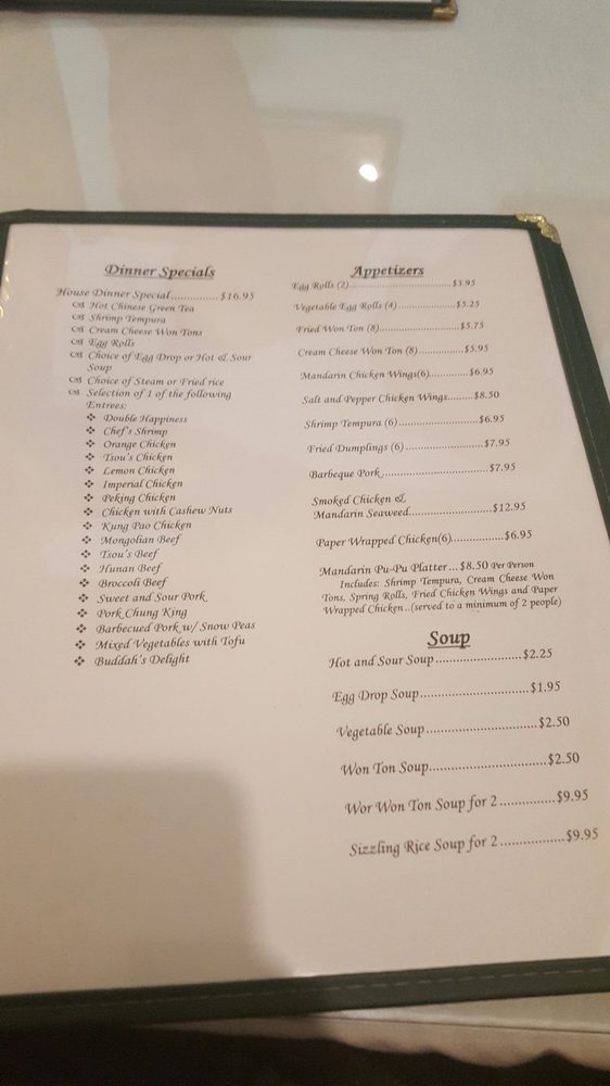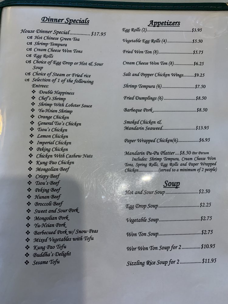 Introducing the menu at Mandarin Wok Restaurant, located in San Diego, CA. This Chinese diner offers a variety of appetizers, including BBQ Pork, Egg Rolls, and Shrimp Tempura. For dinner, indulge in dishes like Beef Chop Suey, Beef SzeChuan, and Beef with Oyster Sauce. Soup options range from Egg Drop to Hot and Sour. Customers rave about the cashew chicken and kung pao chicken, praising the quick service and tasty meals. The dinner special, which includes soup, fried apps, and an entree with rice, is a popular choice for diners looking for value. With a cozy, clean atmosphere and hospitable staff, Mandarin Wok Restaurant is a gem for those seeking traditional Chinese cuisine in a relaxed setting.